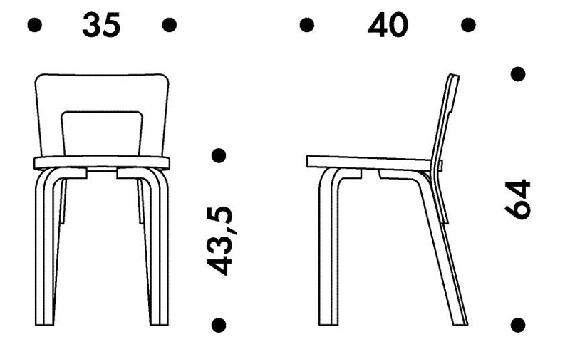 すっきりしたラインとシンプルな構造が特徴的な「チェア 65」。 バーチ材の合板によるやや低めの背もたれは、テーブルや机の下に椅子をしまいやすく、 さらに人の身体に沿うよう緩やかにカーブを描き、腰掛ける人の背中を優しく受け止めます。チェア65は、アルヴァ・アアルトが開発した「L - レッグ」と、「スツール 60」の丸い座面が部品として使われています。 同デザインの子供向けチェアも展開しています。