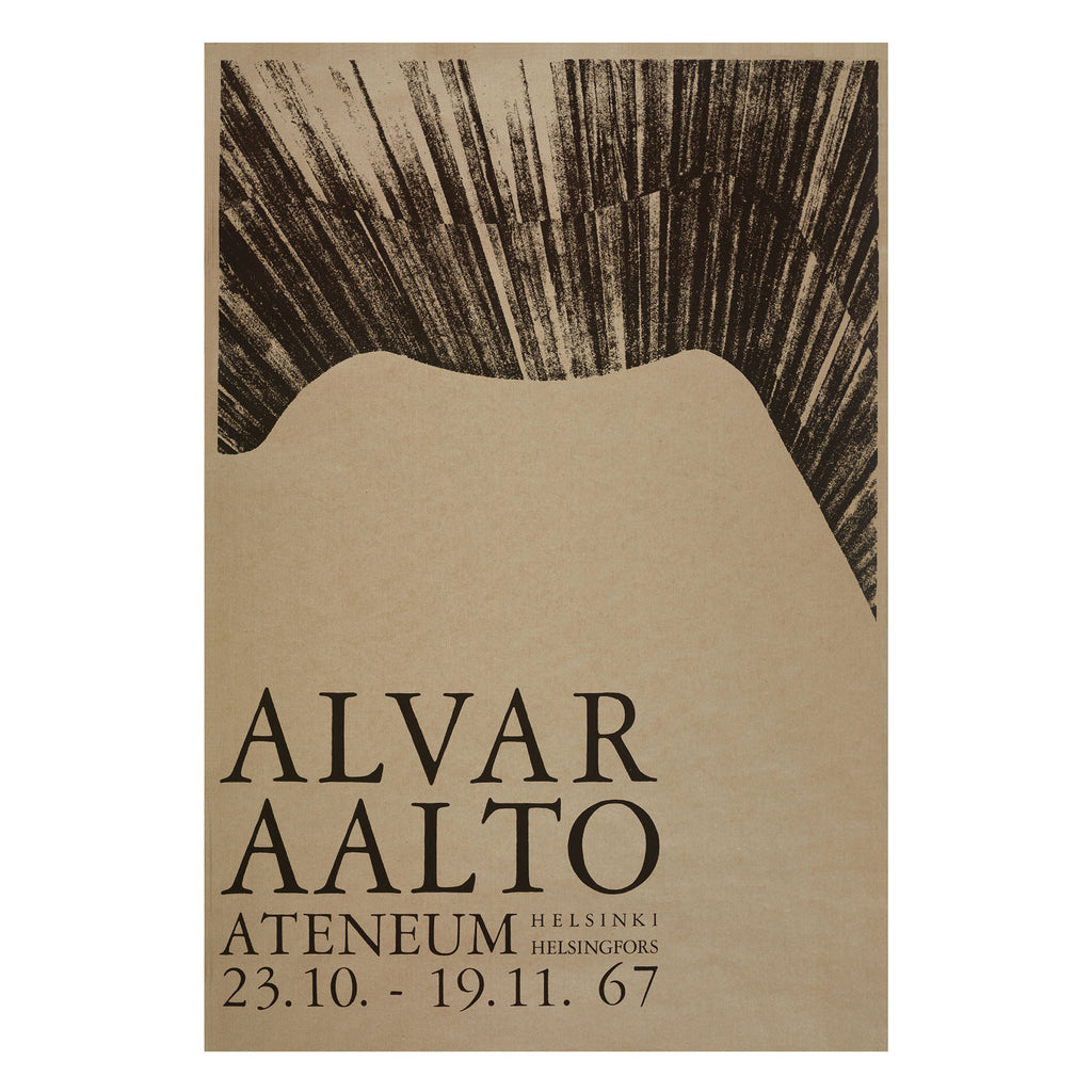 1967年、ヘルシンキのアテネウム美術館にて開催されたアルヴァ・アアルトの建築家としての50年のキャリアを祝う回顧展のポスターです。この展覧会は、1965年から66年にイタリアのフィレンツェで開催された、”Alvar Aalto Palazzo Strozzi”の展覧会をもとに再構成したものです。アルヴァ・アアルトが手掛けた初期の名作建築であるヴィープリの図書館の有機的な天井のフォルムが描かれ、2サイズ展開します。