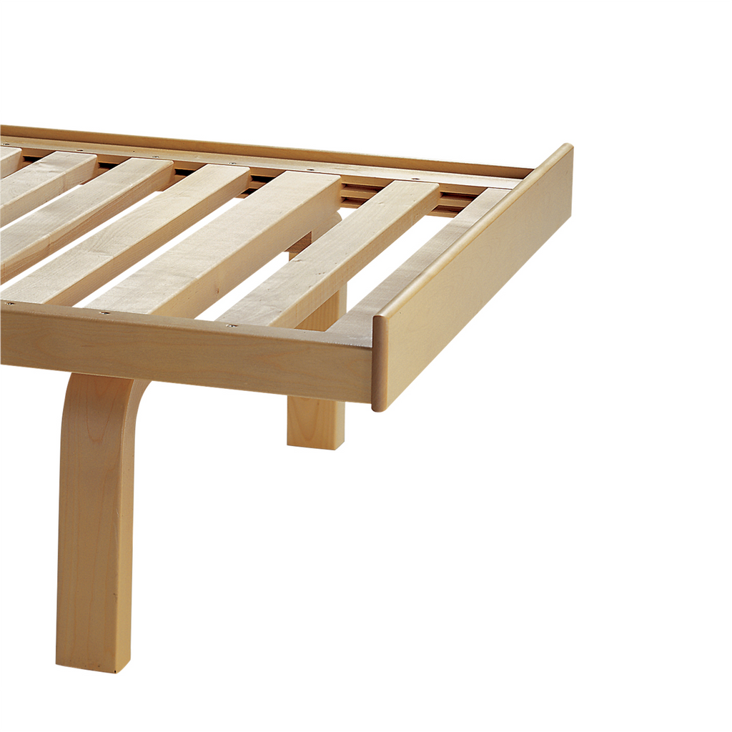 「デイベッド 710」は、アルヴァ・アアルトが開発した曲げ木の技術「L - レッグ」を応用したシリーズのひとつです。スツールやチェアに使われているL - レッグの脚の上に、木製のフレームを設置するシンプルかつ頑丈な構造で、必要に応じて脚部を取り外すことができます。バーチ材によるデイベッド 710は、マットレスを置いてベッドとしても、背もたれになるバッククッションと組み合わせてソファとしても使うことができます。