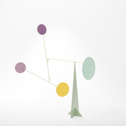 針金で繋がれたアルミニウム合金のモビールは、安定感あるスチール製台座の上で、まるで植物の葉のように、空気や風の流れを受けて揺らめき、時にやわらかく回転します。専用ボックス入りで、大切な方への心に残る贈り物としてもおすすめです。