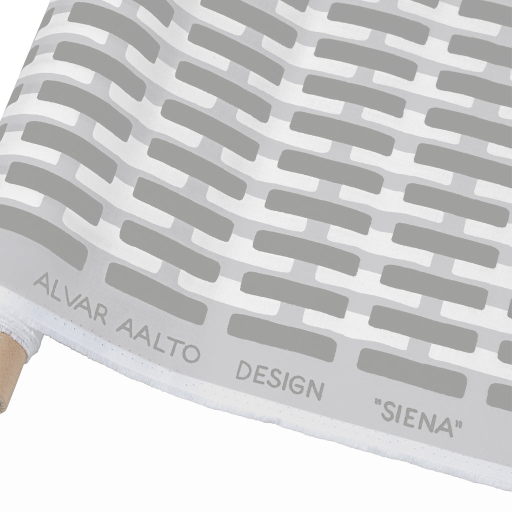 アルヴァ・アアルトが1954年にデザインしたテキスタイルパターン「シエナ」は、アアルト夫妻が幾度も訪れたイタリアの都市の街並みと、ドゥオモ広場に位置するシエナ大聖堂に着想を得て描かれたと言われています。「グレー / ライト グレー シャドー」は、アルヴァ・アアルトの多産なキャリアの中でも比較的後期の作品に好んで使われた大理石をイメージしたカラーです。大理石を用いたアアルト建築として、ヘルシンキのフィンランディアホールや国民年金局、ラウタタロのオフィスビルなどが挙げられます。